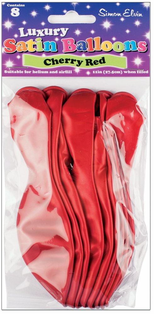 A pack of 11-inch satin-finish balloons in a rich cherry red colour. These balloons have a smooth, glossy look that adds an elegant touch to birthday parties, celebrations, and themed décor. Suitable for air or helium inflation