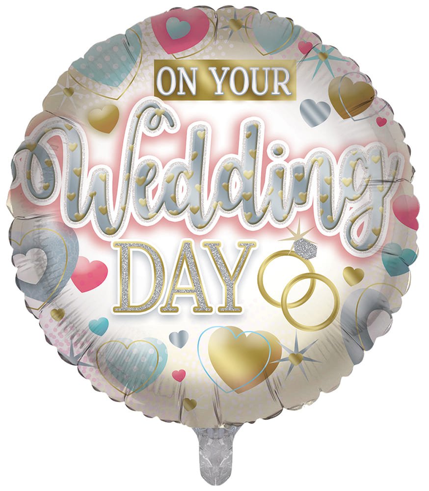 Elegant round foil balloon featuring a soft pink and white Wedding Day design with gold accents, hearts, and wedding rings. Perfect for wedding celebrations, receptions, bridal décor, photo areas, and gift table displays. Suitable for helium or air inflation.
